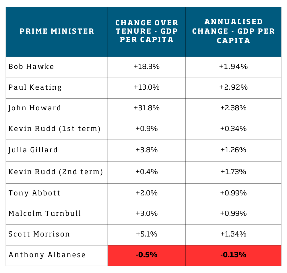 Let's look deeper on this second point first. GDP per capita is a rough measure of how much the economy is producing for each Australian. It matters because headline GDP can rise even while Australians go backwards on a per-person basis. Anthony Albanese is the first Prime Minister to preside over a reduction in GDP per capita since the ABS started tracking their current series.
